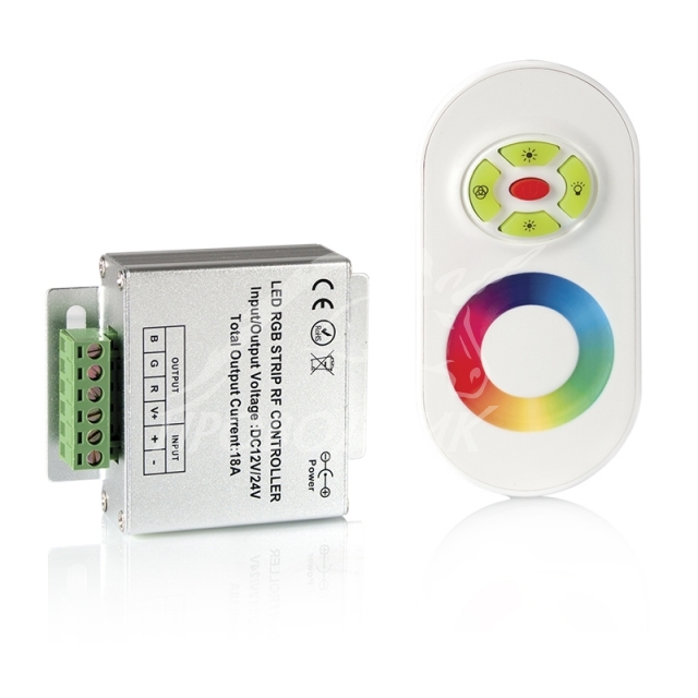 Контролер для светодиодных лент снабжен сенсорным пультом, удобно располагаемым в руке и работающим в радиусе 20 метров. Мощности в 144Вт хватает для управления 20-ю метрами ленты с 7,2Вт на каждый метр или 10-ю метрами ленты с мощностью 14,4Вт на метр. Профессиональный контроллер предлагает 640 тыс. цветовых комбинаций и 15 подготовленных световых эффектов. Частота передачи сигналов пульта 433.93 МГц разрешена в бытовых условиях.