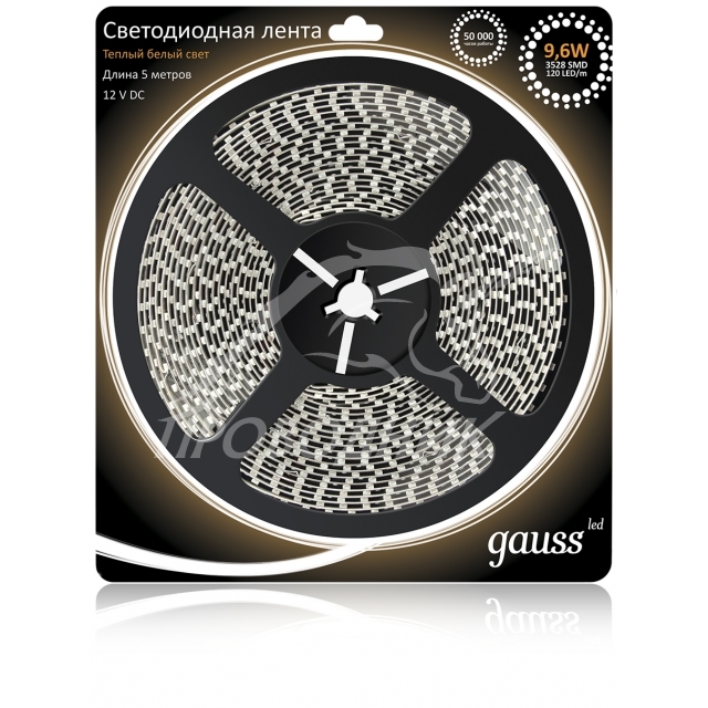 Светодиодные ленты Gauss открывают возможности подсветки фасадов без больших затрат. Каждый метр – это 120 светодиодов с мощностью 9,6Вт и световым потоком около 600Лм.