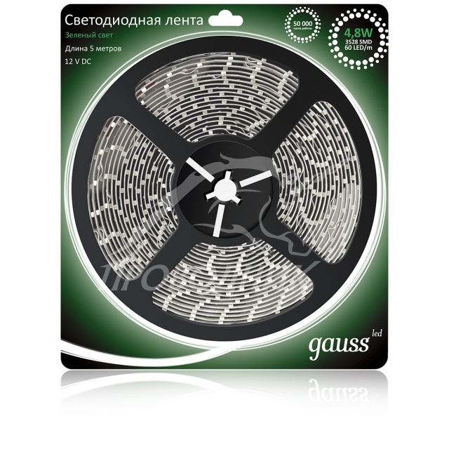 Зеленые светодиоды Gauss располагаются на самоклеющейся ленте длиной в 5 метров в количество 60 штук на один метр и потребляют 4,8Вт. Светодиоды отличаются большим сроком службы – до 50 тыс. часов, чем делают подсветку доступнее и экономичнее. Степень защиты IP20 позволяет размещать светодиодные ленты в любых жилых и нежилых помещениях с нормальным уровнем влажности и запыленности. Большая светоотдача при потреблении 24Вт на катушку дает световой поток с интенсивностью в 1500Лм, который поможет реализовать любые дизайнерские решения.