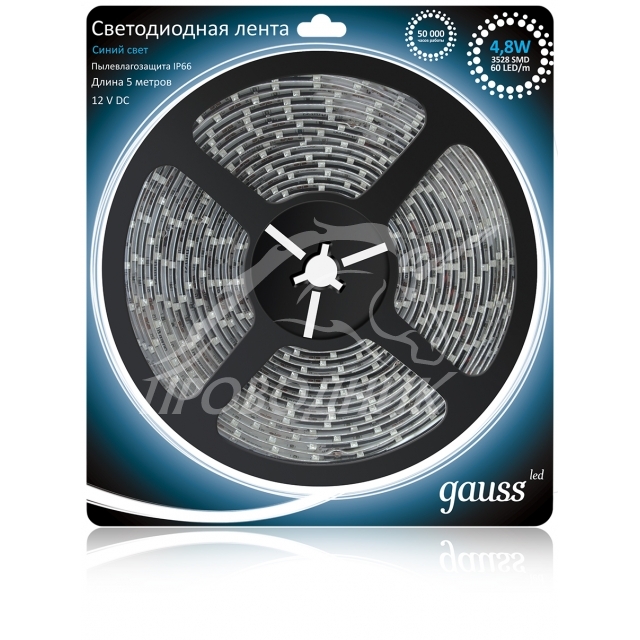 Светодиодные ленты Gauss снабжаются производительными и экономичными светодиодами в количество 60 штук на каждый метр. Лента длиной в 5 метров имеет самоклеющееся основание, которое надежно удерживает ее при любых уличных температурах. Яркий световой поток составляет 1500Лм на всю ленту при потреблении всего 4,2Вт на каждый метр.